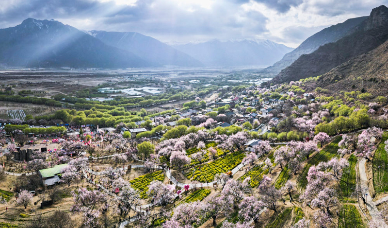 这是在西藏林芝市巴宜区嘎拉村拍摄的桃花(2025年3月29日摄,无人机全景照片)。(新华社记者 齐芷玥/摄)
