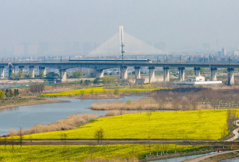 2026年3月11日,一列高铁列车穿行在安徽省合肥市肥东县十八联圩生态湿地(无人机照片)。(新华社记者 杜宇/摄)