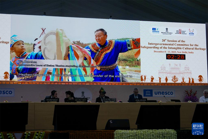 12月11日,在印度新德里举行的联合国教科文组织保护非物质文化遗产政府间委员会第20届常会上,大屏幕上播放中国“赫哲族伊玛堪”保护成果。(新华社记者 伍岳/摄)
